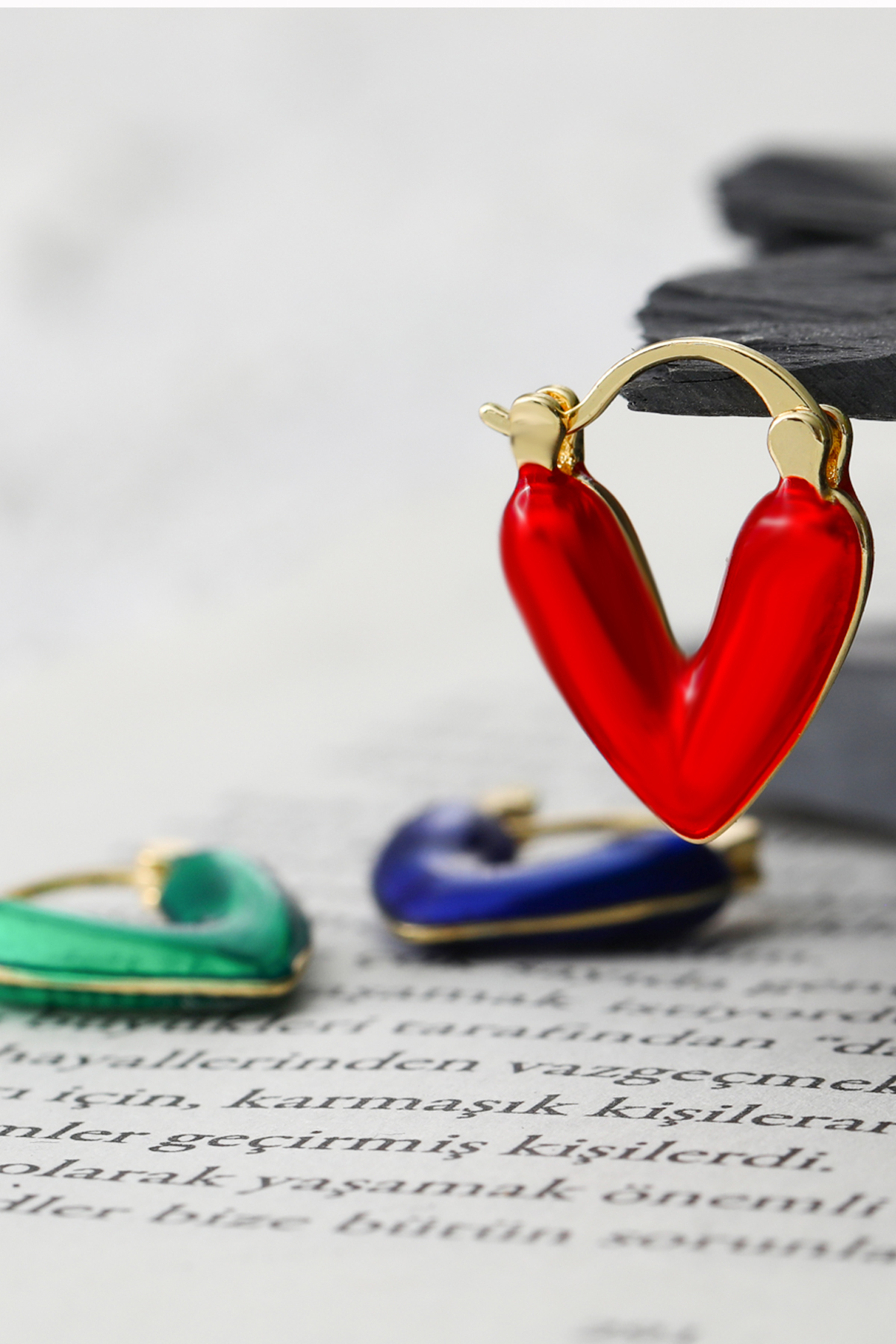 • 3 farklı renkte (kırmızı, mavi, yeşil) kalp detaylı küpe