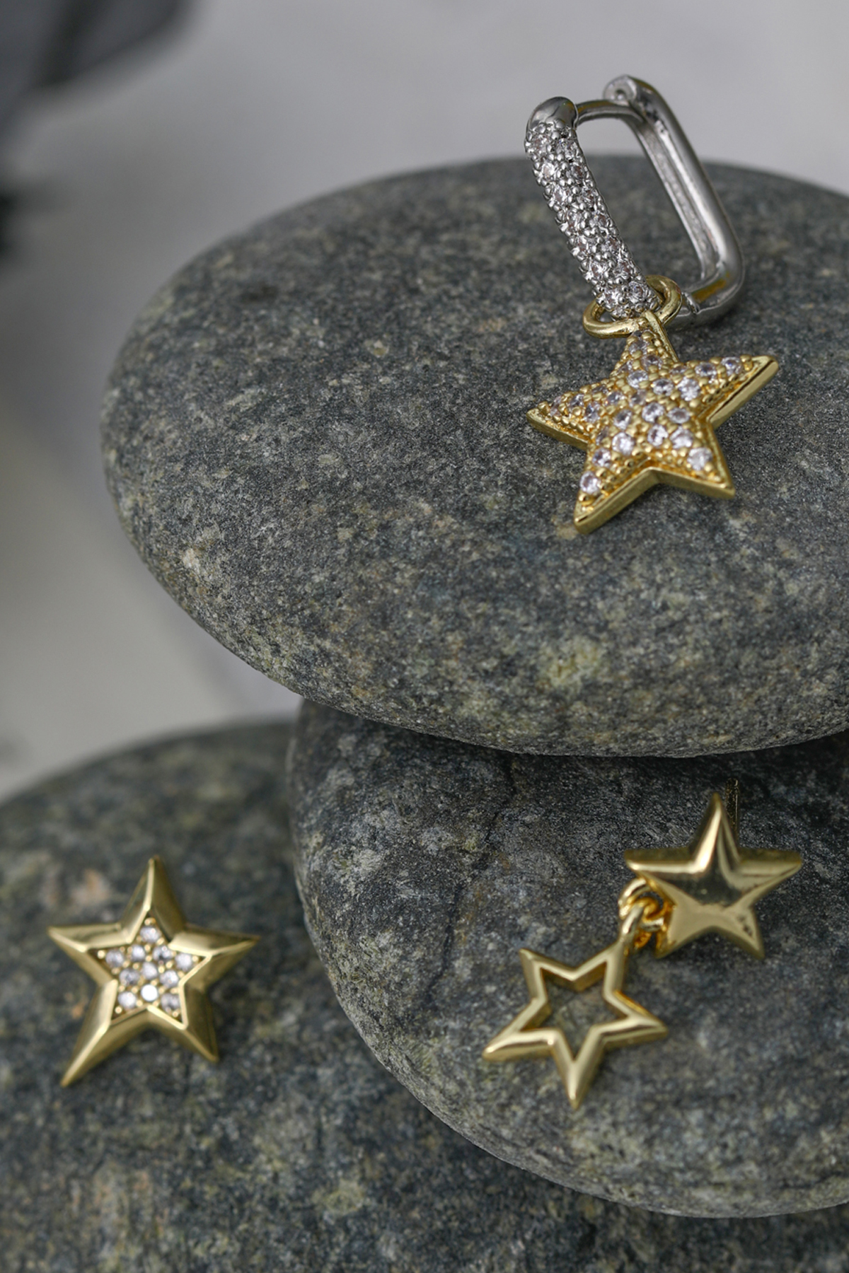 Üçlü Yıldız Küpe, modern ve minimal tasarımıyla stilinizi tamamlayacak zamansız bir aksesuardır. Paslanmaz çelikten üretilen bu küpe, kararma yapmaz, uzun