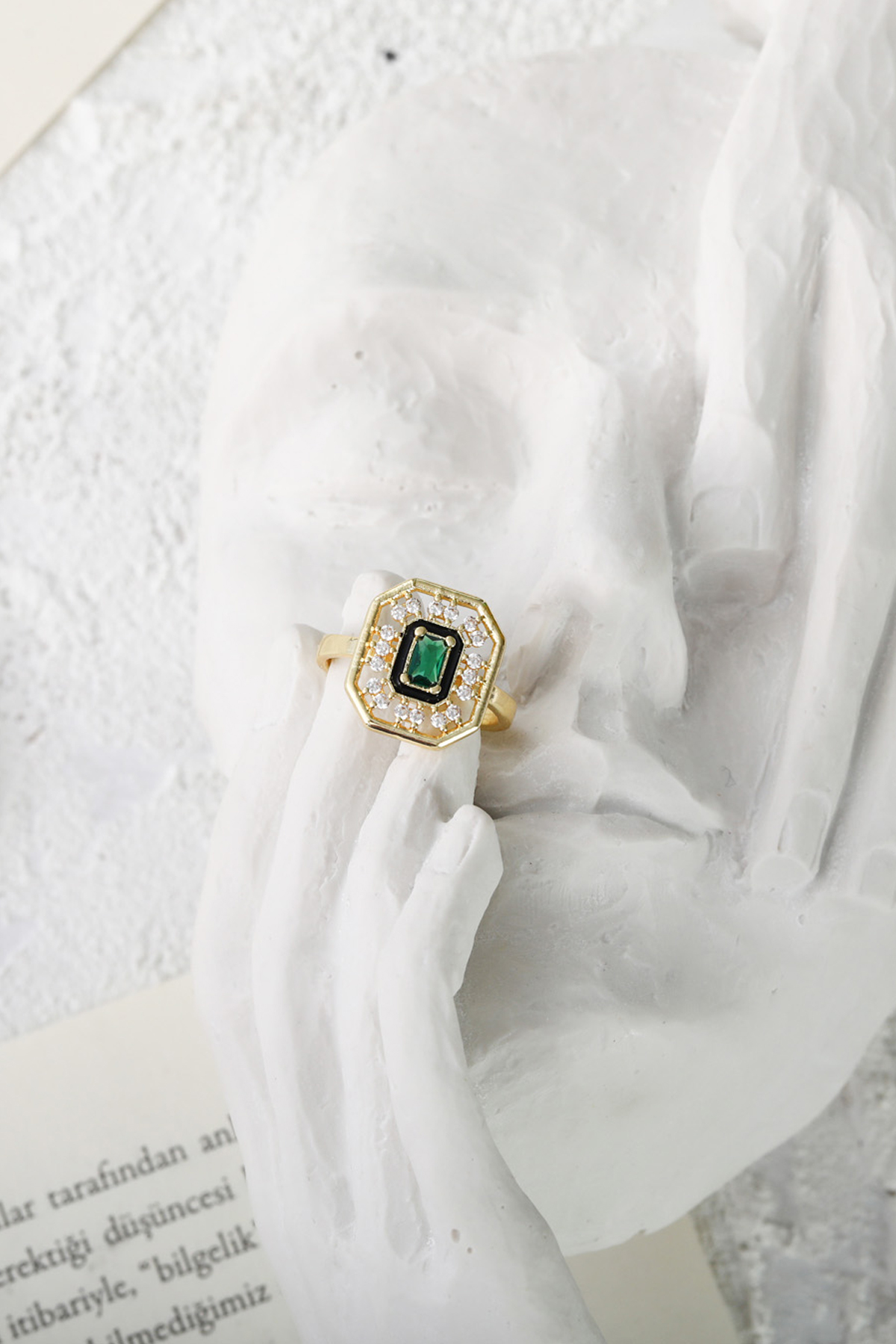 Doğanın canlı tonlarını yansıtan yeşil taşı, modern baget kesimiyle buluşturan bu yüzük, hem kendiniz hem de sevdikleriniz için şık bir hediye seçeneği olabilir.