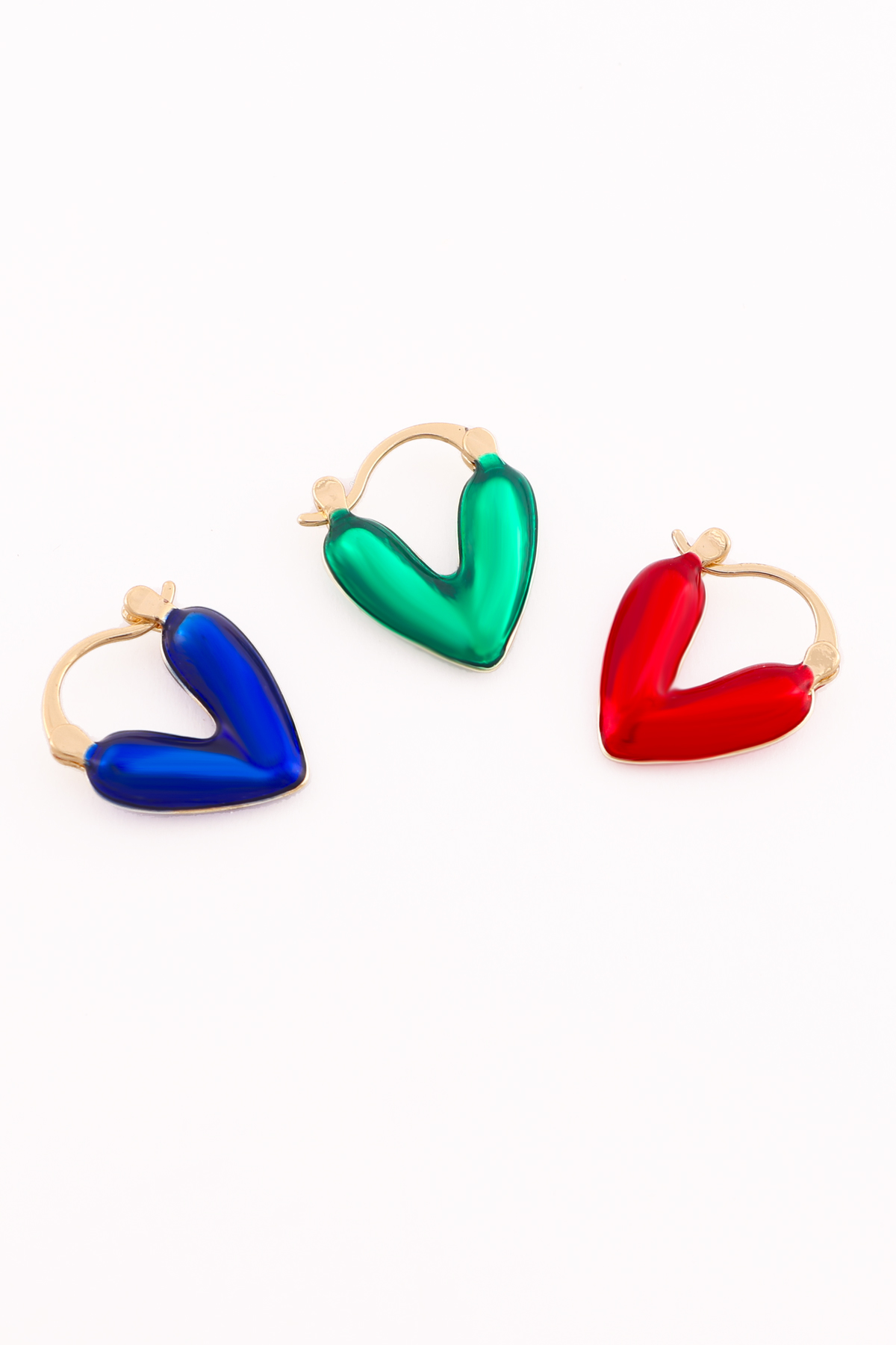 • 3 farklı renkte (kırmızı, mavi, yeşil) kalp detaylı küpe