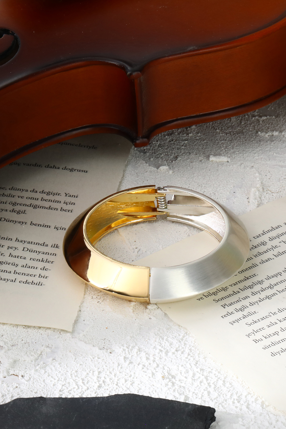 Altın ve gümüş tonlarını bir arada sunan bu kelepçe, hem klasik hem de modern stil severler için mükemmel bir seçenektir. Çift renk tasarımı sayesinde takı seçiminde özgürlük sağlar ve stilinizi zahmetsizce tamamlar.